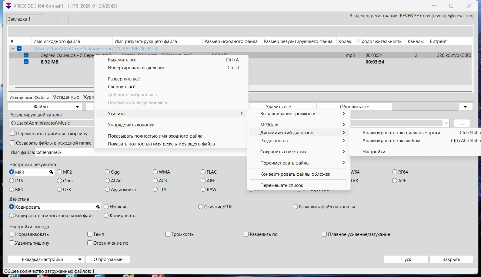 XRecode — быстрый и универсальный аудиоконвертер, предназначенный для удобного преобразования звуковых файлов между различными форматами. Программа поддерживает более 30 популярных форматов, включая MP3, FLAC, WAV, AAC, OGG, WMA, и многие другие, что делает её идеальным инструментом как для новичков, так и для опытных пользователей. XRecode не только конвертирует аудиофайлы, но и предоставляет функции для их редактирования, таких как изменение битрейта, частоты дискретизации, а также разделение или слияние треков.