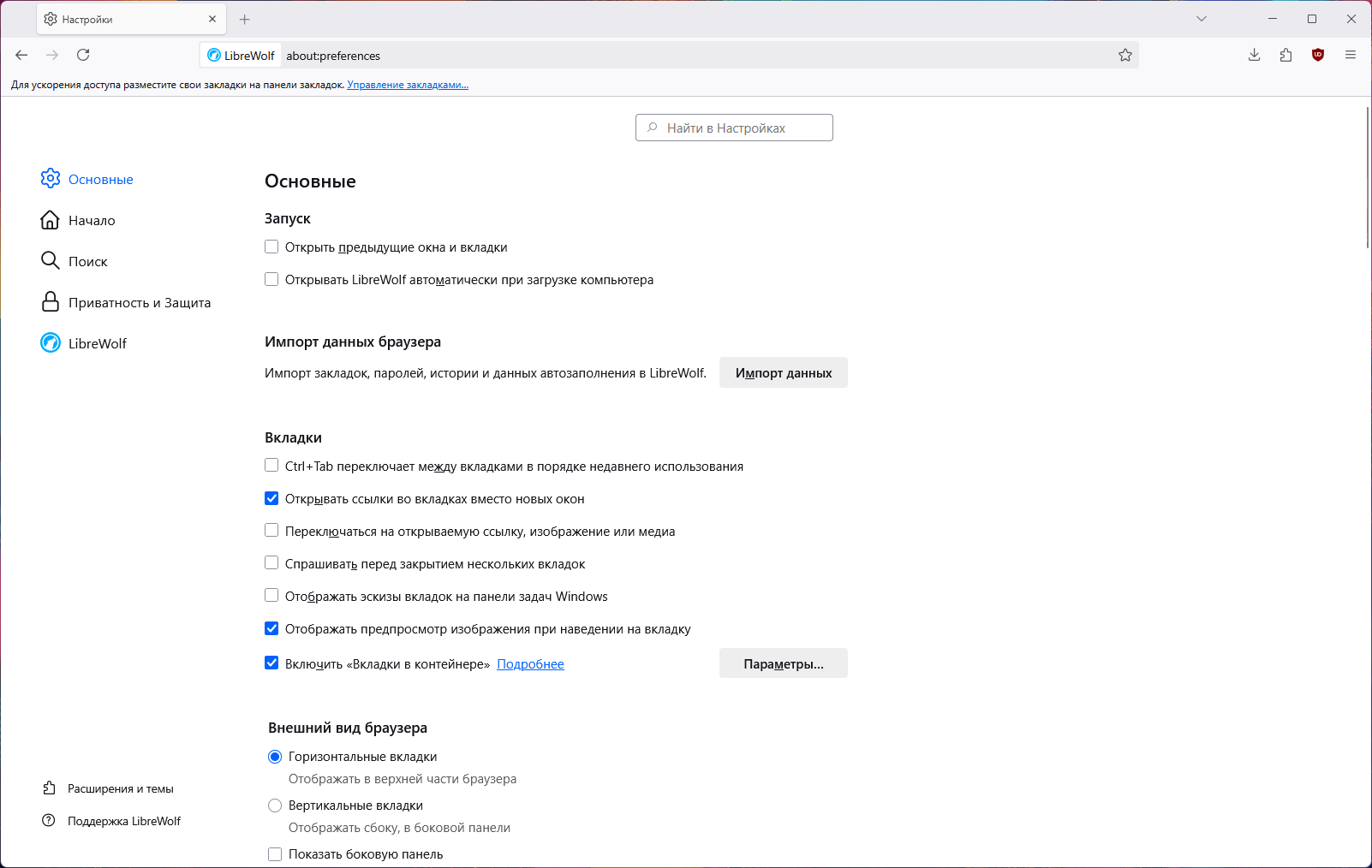 • Специальный пользовательский интерфейс LibreWolf, который отображает наиболее важные настройки конфиденциальности и безопасности, позволяя вам легко управлять ими.