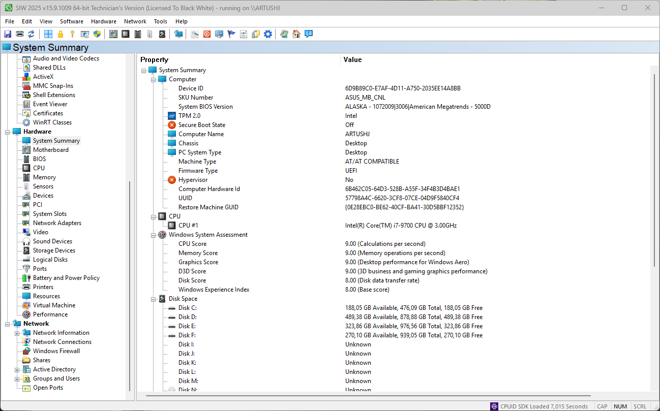 SIW (System Info For Windows) - системная программа для отображения детальной информации об аппаратной, сетевой и программной части вашей системы. Программа позволяет собирать детальную информацию о всех ваших системных настройках и параметрах и отображает эту информацию чрезвычайно понятным пользователю способом. По своим возможностям данная утилита аналогична популярным программам подобного рода, но в отличии от них обладает совершенно простым интерфейсом без излишеств, а также имеет бесплатную версию для некоммерческого использования. Программа отображает информацию об операционно системе, обновлениях, системных папках и файлах, установленных программах, запущенных процессах в детальном виде, предоставляя список всех используемых файлов выбранного процесса, драйверах и службах, установленном оборудовании, включая информацию о материнской плате, процессоре, BIOS''е и т.д. По выданным данным вы сможете создать файл отчета в форматах CSV, HTML, TXT или XML..