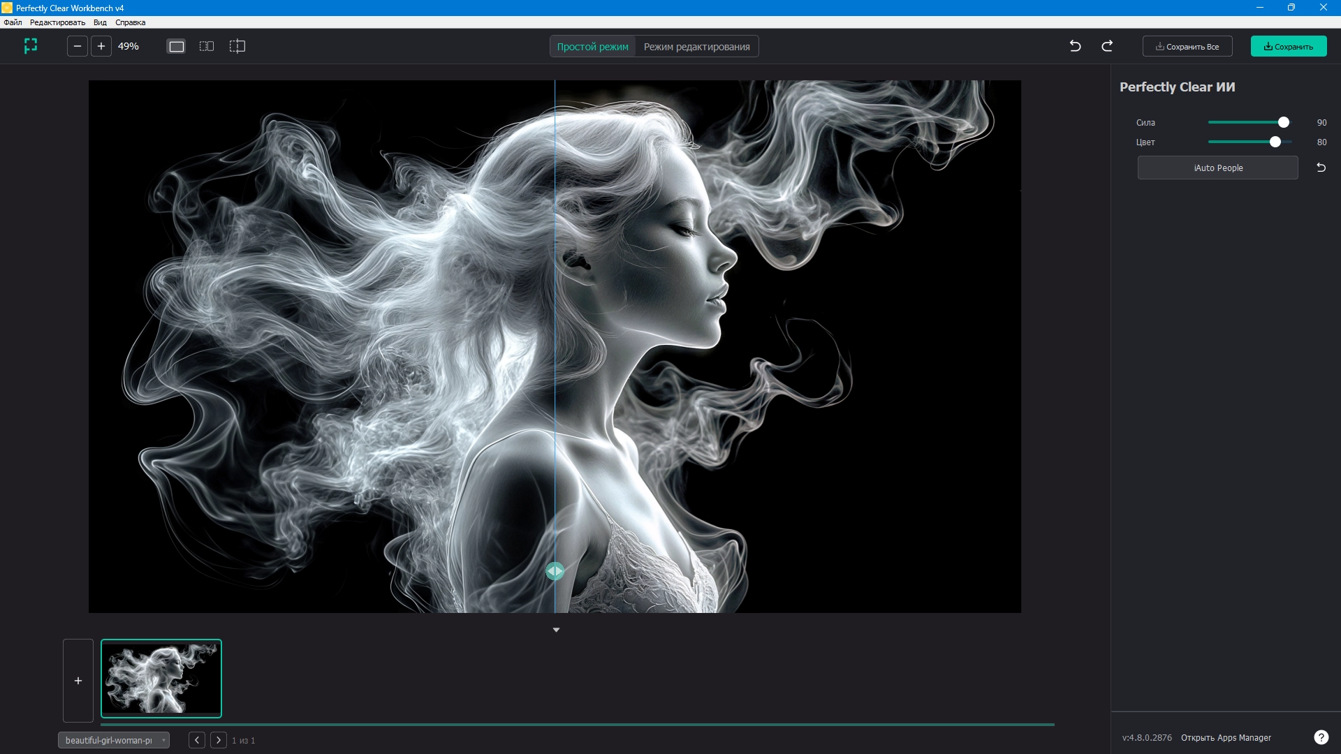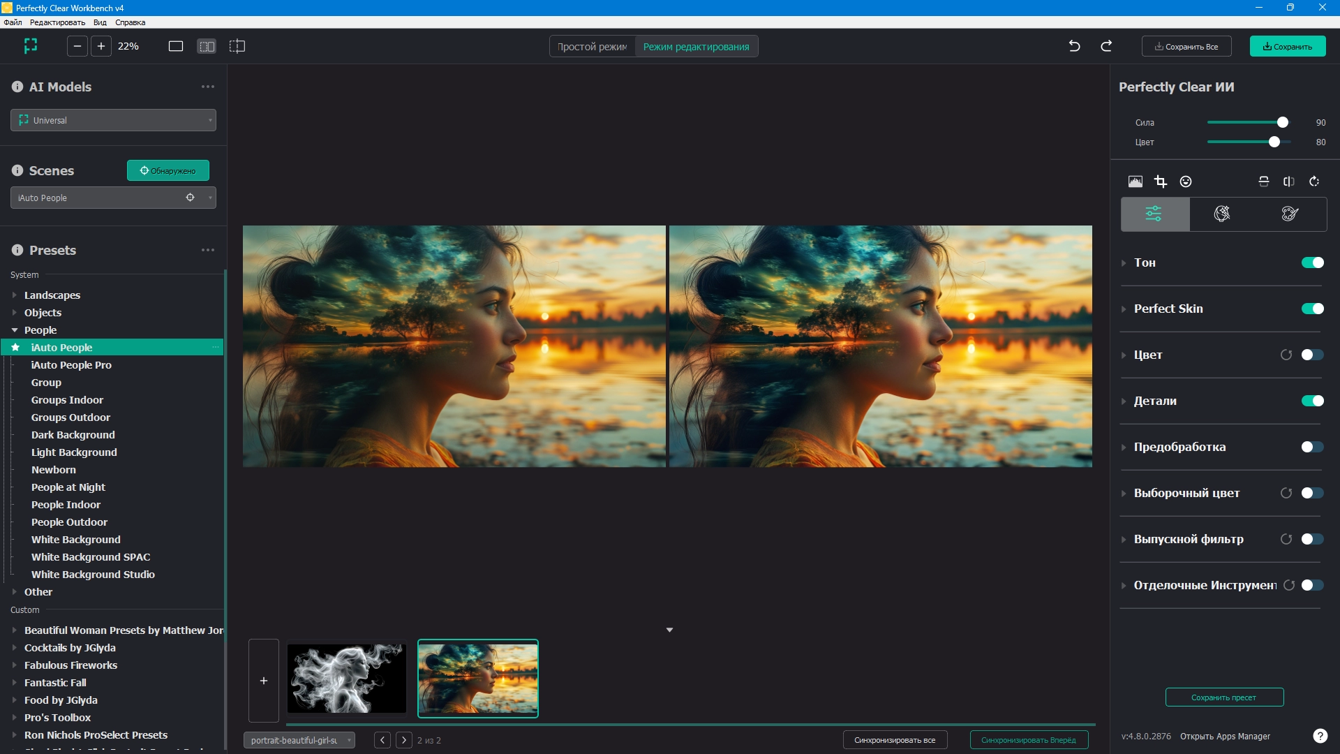 Основная особенность Perfectly Clear — это автоматизация процесса редактирования. Используя мощные технологии искусственного интеллекта и машинного обучения, Perfectly Clear анализирует каждый снимок и корректирует его параметры, такие как яркость, контраст, экспозиция, цветовые балансы, резкость и шум, в реальном времени. Все изменения выполняются без необходимости вручную регулировать настройки, что экономит время и позволяет получить оптимальный результат в считанные секунды.