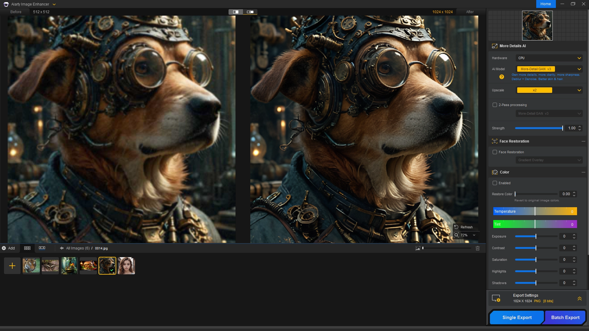 Программа позволяет легко улучшать фотографии и AI-арт, делая процесс максимально автоматизированным: загрузите изображение, выберите модель ИИ и масштабирование, а затем экспортируйте улучшенные изображения