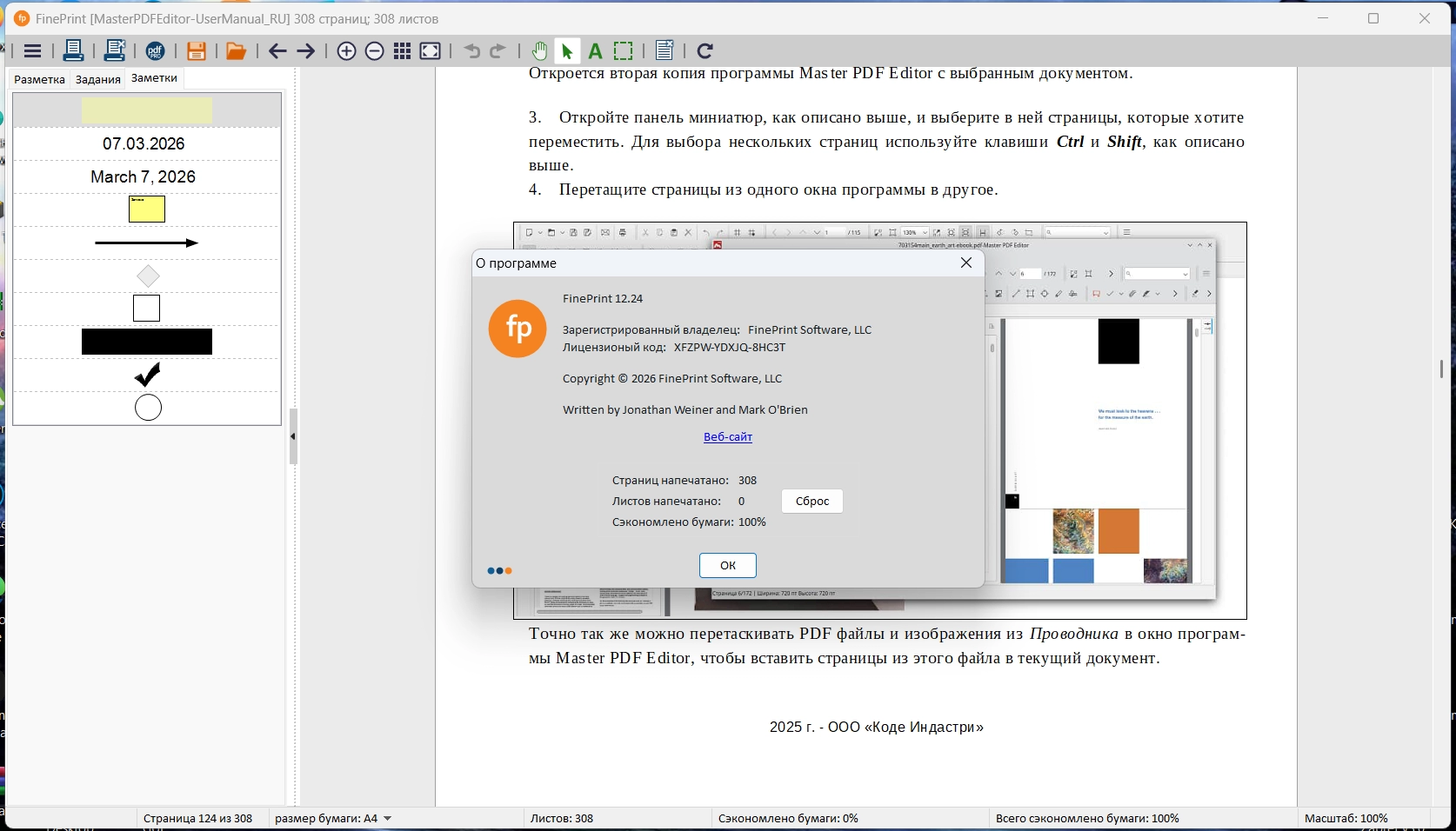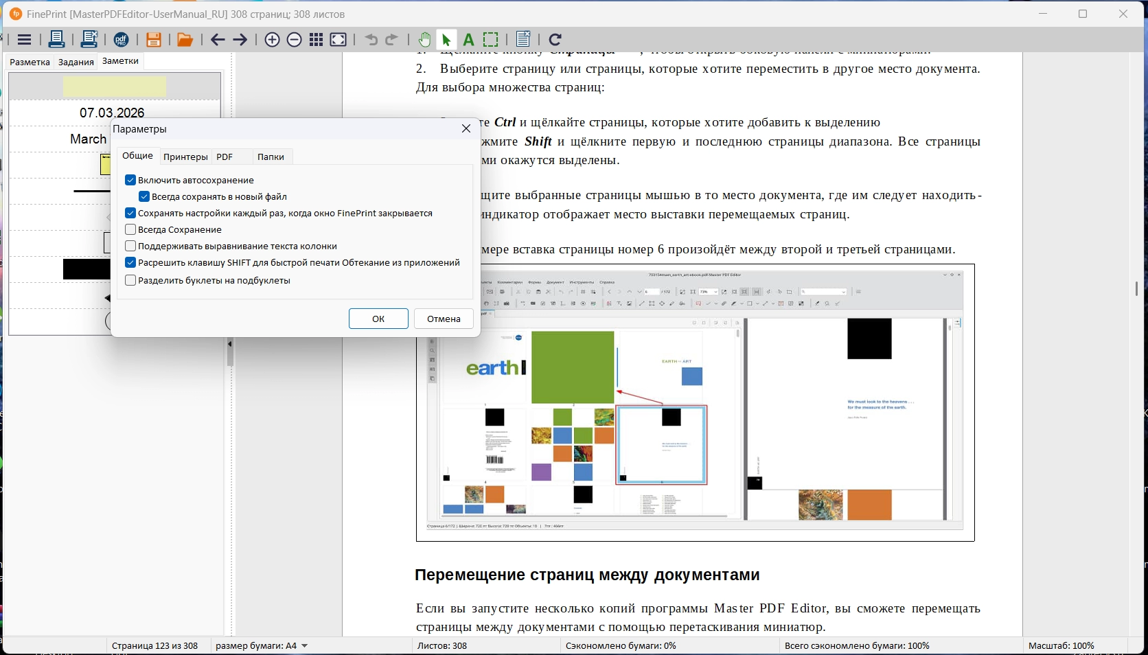 • Отображение количества сэкономленной при помощи FinePrint бумаги