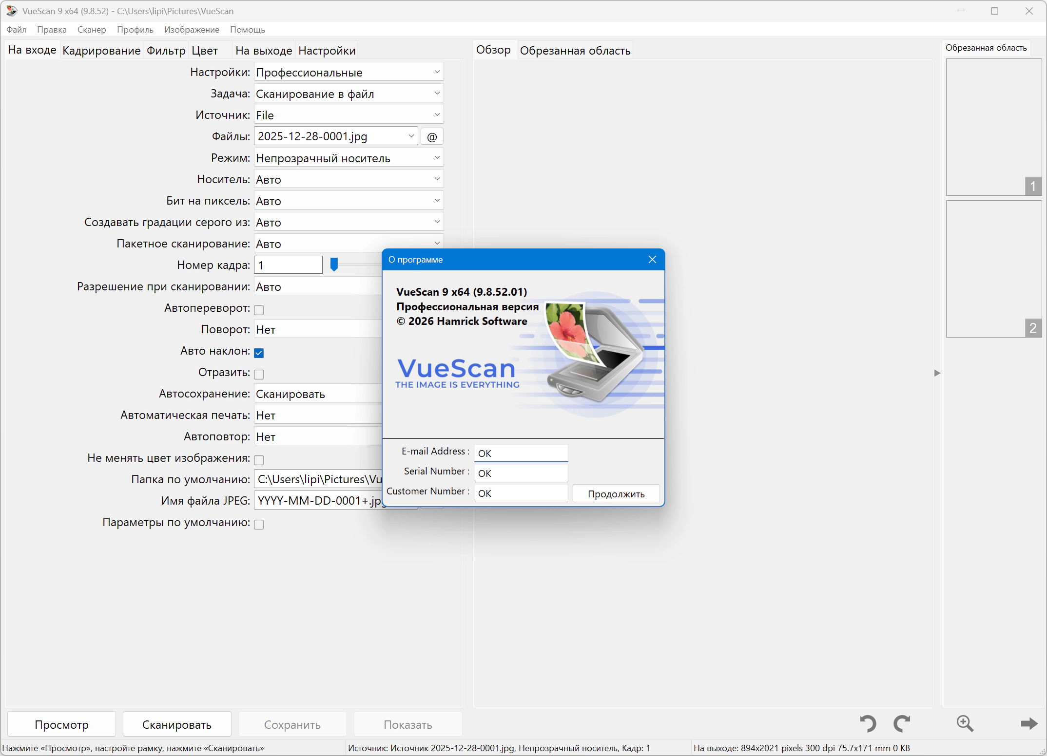4. Запустить VueScan и ввести в окно регистрации данные из VueScan KeyGen