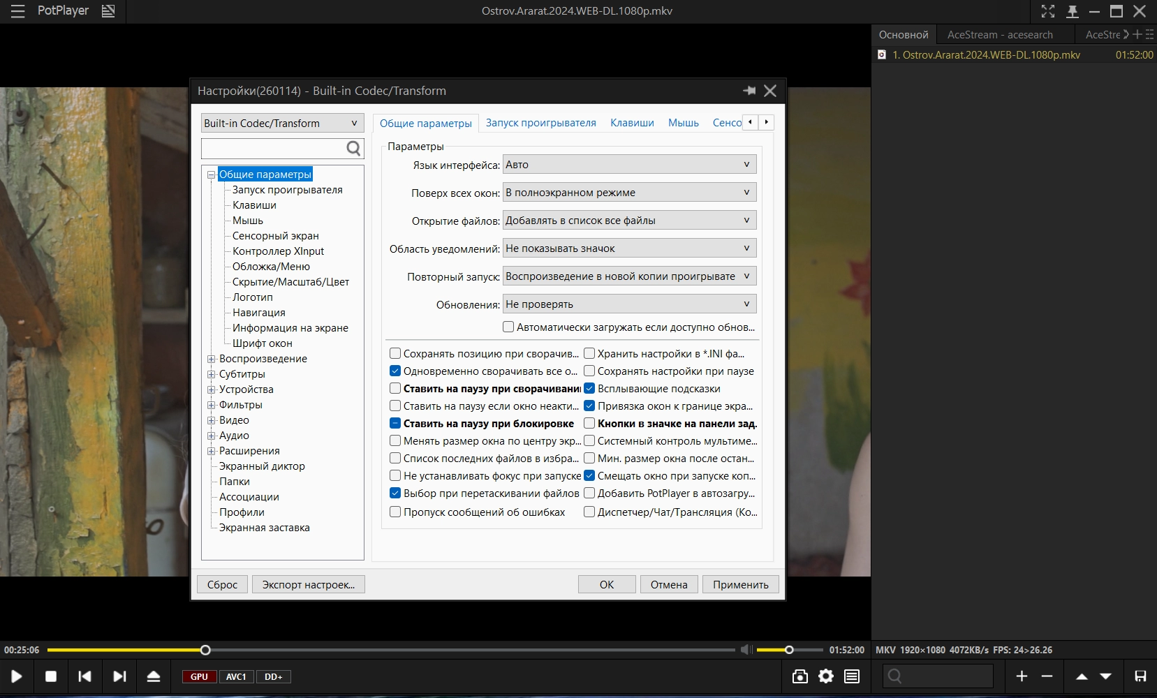 • Аппаратные декодеры DXVA2, D3D11, QS, CUDA (H264/AVC,H265/HEVC,AV1,VP9,VC1,WMV3,MPEG2,MPEG4)