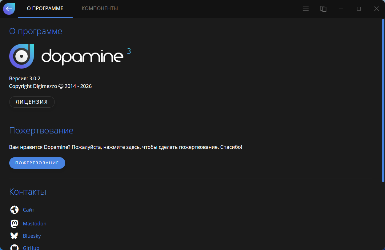 Dopamine — элегантный аудиоплеер, который стремится сделать организацию и прослушивание музыки максимально простыми и привлекательными. Эта версия написана на Electron, Angular и TypeScript.