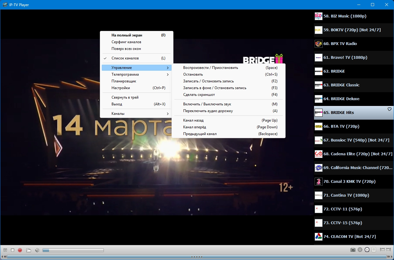 IP-TV Player - это высококачественный проигрыватель для вещания эфирных каналов IP-телевидения. Индивидуальные настройки для каналов, возможность записи потока в файл. Поддерживаются телепрограммы в формате JTV, планировщик записи/просмотра, фоновая запись.