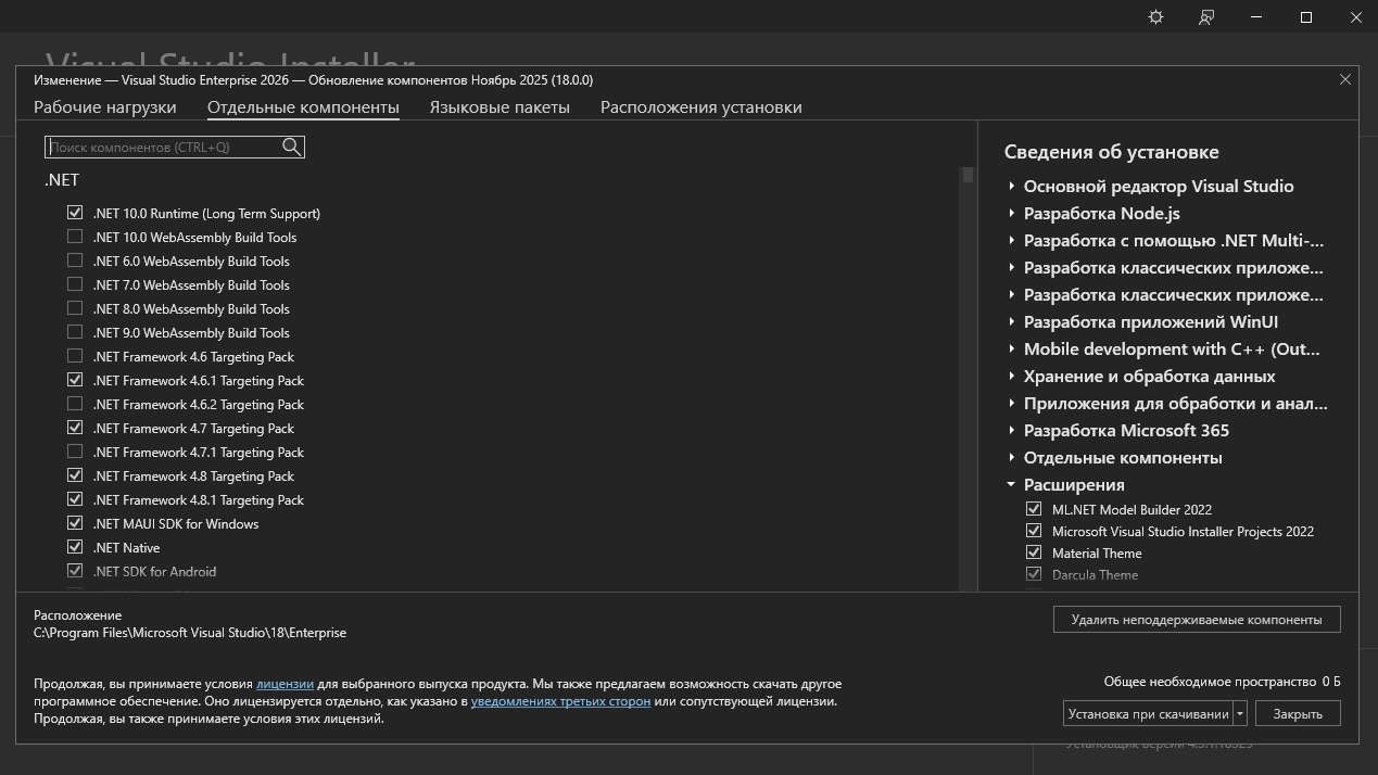 • Для установки Visual Studio необходима платформа .NET Framework 4.7.2 или более поздней версии. Visual Studio требует запуска .NET Framework 4.8. Если платформа .NET Framework 4.8 еще не установлена, то будет выполнена ее установка.