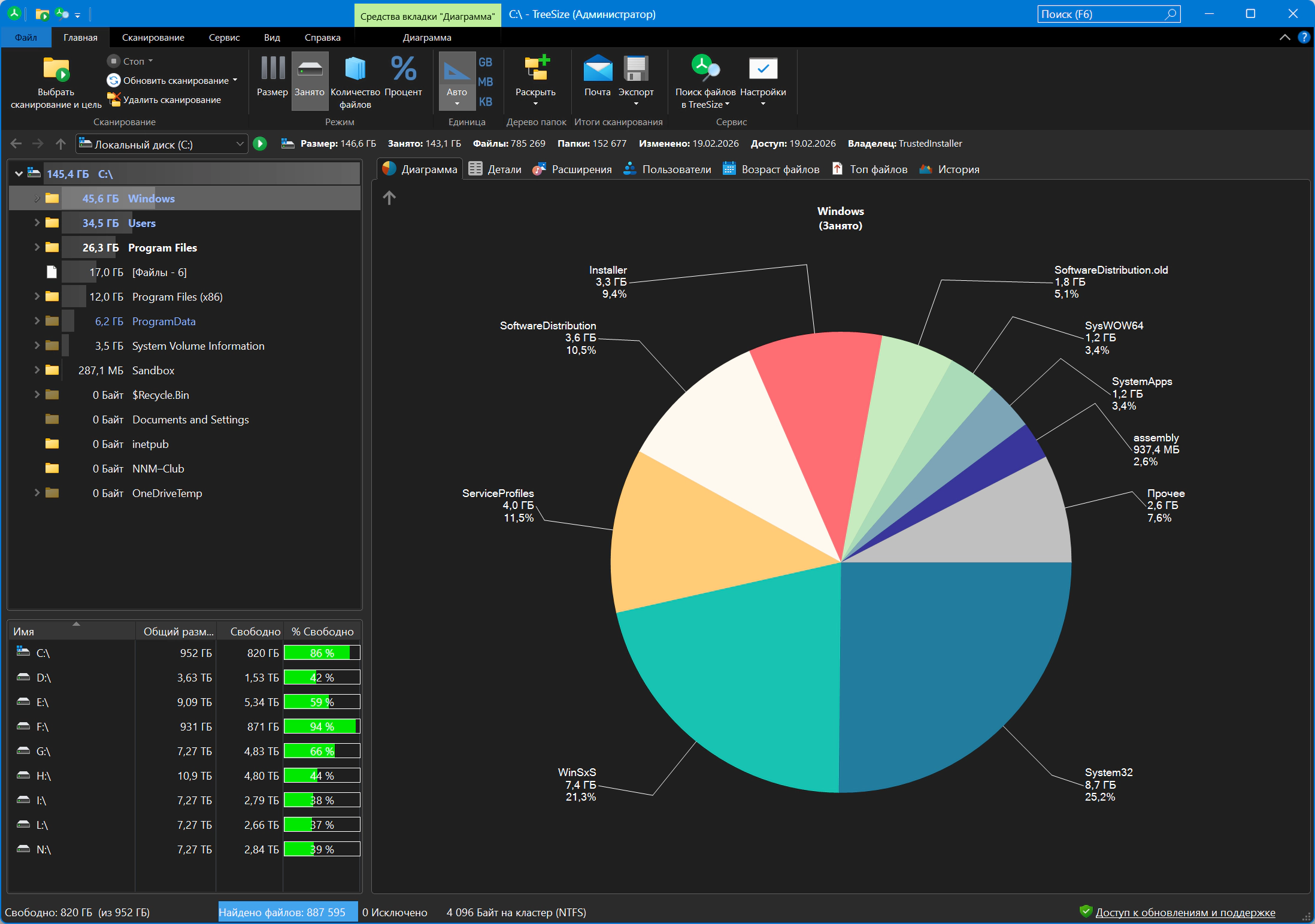 TreeSize — инструмент для анализа и управления дисковым пространством. С его помощью вы сможете быстро и легко узнать, какие файлы и папки занимают больше всего места на ваших жестких дисках. TreeSize предоставляет детализированные отчеты, визуализации и графики, что позволяет эффективно управлять данными и оптимизировать использование дискового пространства.