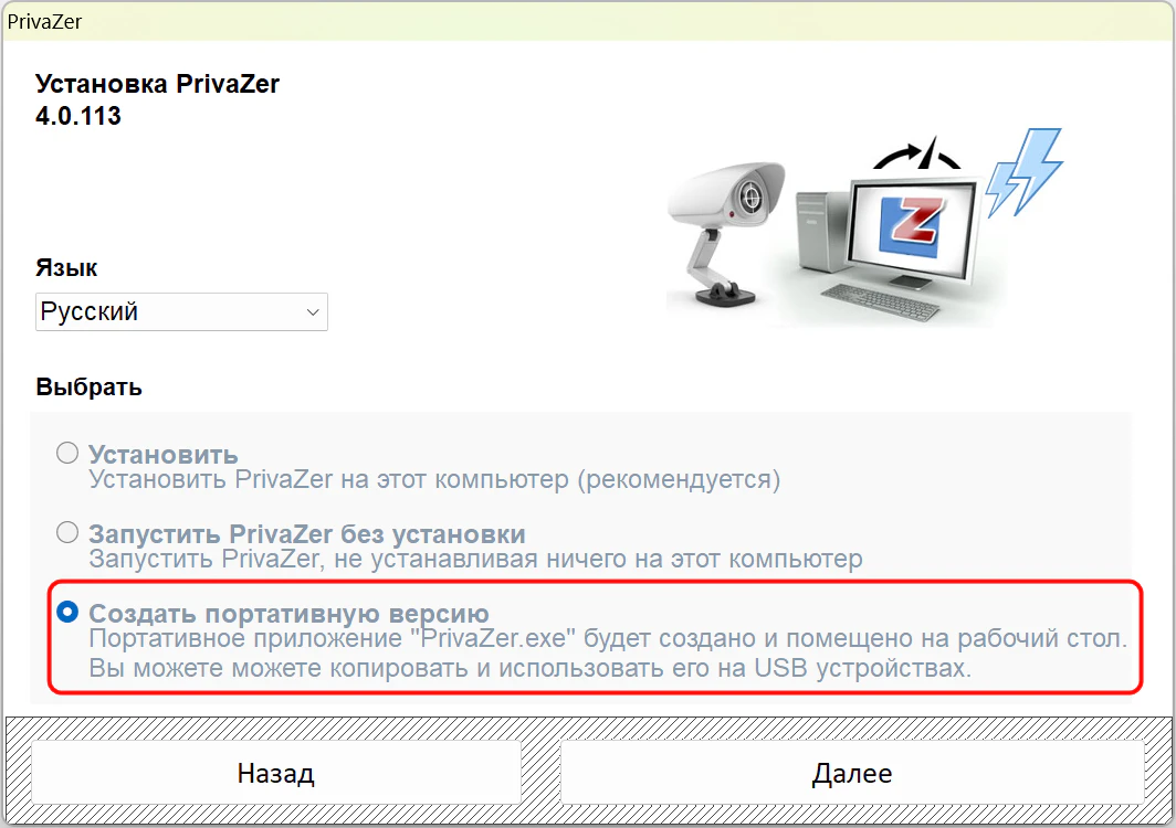 • Портативную версию можно получить в начале установки, выбрав соответствующую опцию: