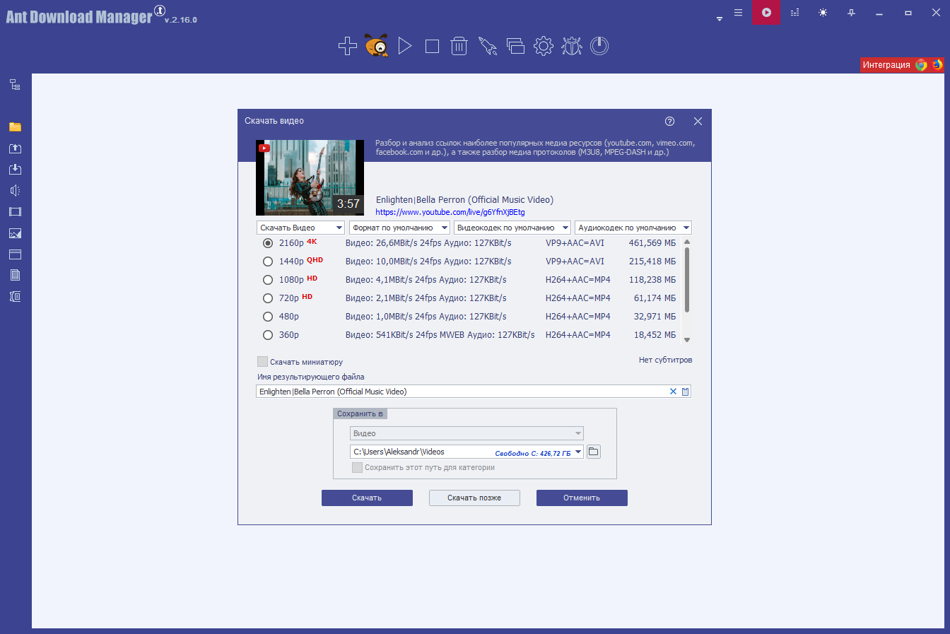 Ant Download Manager предоставляет возможности для скачивания контента из социальных сетей и видео хостингов, а также поддерживает мультипотоковую загрузку и планировщик задач для максимального контроля над процессом загрузки.