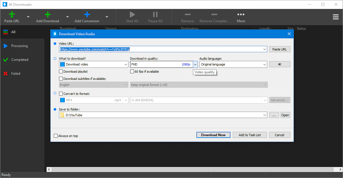 • Программа имеет современный и интуитивно понятный интерфейс, который вряд ли доставит вам хлопот. Если вы выбрали видео, которые хотите загрузить, все, что потребуется сделать, это скопировать, поскольку приложение может автоматически вставить URL-адрес. Тем не менее, вы можете указать, хотите ли вы, чтобы загрузка была только аудио, выбрать доступное качество или преобразовать его в Ultra HD. В то же время приложение позволяет вам указать, хотите ли вы сразу загрузить видео или добавить его в список задач, чтобы его можно было захватить позже. Вы будете рады узнать, что вы можете загружать списки воспроизведения и несколько файлов так же просто, как и с одним обычным видео. • Включает плеер, а также простую функцию конфертирования видео. После завершения загрузки вы можете сразу же воспроизвести его на любом устройстве по вашему выбору.